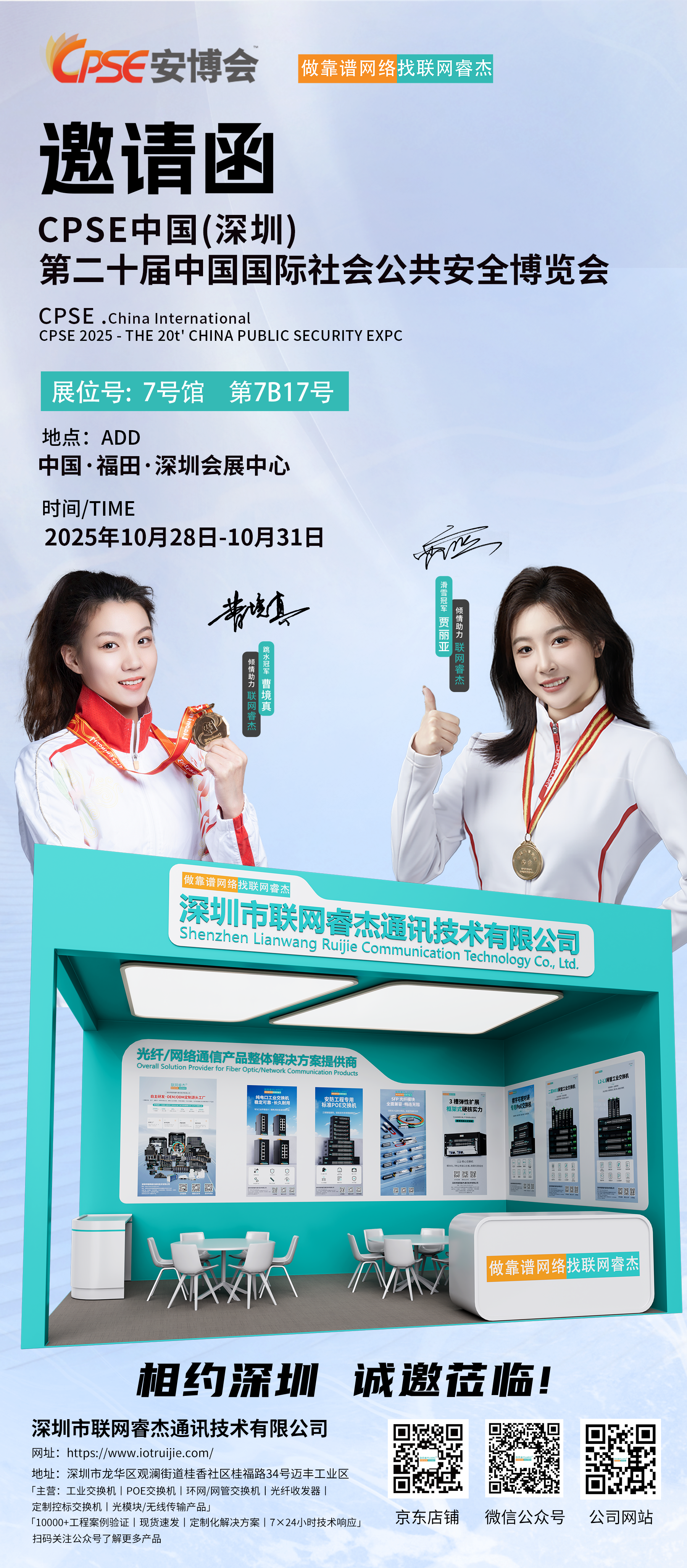 由中國(guó)安全防范產(chǎn)品行業(yè)協(xié)會(huì)、深圳市安全防范行業(yè)協(xié)會(huì)聯(lián)合主辦,深圳市安防展覽有限公司承辦的2025深圳CPSE安博會(huì)(第二十屆中國(guó)國(guó)際社會(huì)公共安全博覽會(huì)),將于2025年10月28日-31日在中國(guó)·福田·深圳會(huì)展中心盛大開(kāi)幕!作為安防領(lǐng)域標(biāo)桿盛會(huì),本屆安博會(huì)聚合全球資源,以“超2000家企業(yè)、10萬(wàn)+專(zhuān)業(yè)觀眾、全維度前沿技術(shù)展示”的規(guī)模,全方位呈現(xiàn)智慧安防、視頻監(jiān)控、物聯(lián)網(wǎng)安防等領(lǐng)域的創(chuàng)新技術(shù)與解決方案,是安防人洞察行業(yè)趨勢(shì)、鏈接產(chǎn)業(yè)資源的核心窗口。深圳市聯(lián)網(wǎng)睿杰通訊技術(shù)有限公司秉持“做靠譜網(wǎng)絡(luò) 找聯(lián)網(wǎng)睿杰”的品牌理念,借品牌代言人的勢(shì)能加持,以源頭制造的供應(yīng)鏈優(yōu)勢(shì),打造OEM/ODM+技術(shù)服務(wù)供銷(xiāo)體系,為廣大中小工程商及B、C端客戶(hù),提供光纖/網(wǎng)絡(luò)通信產(chǎn)品一站式整體解決方案,將在7號(hào)館7B17號(hào)展位,集中展示適配安防場(chǎng)景的全系列通信產(chǎn)品,為安防系統(tǒng)穩(wěn)定運(yùn)行筑牢網(wǎng)絡(luò)底座。?工業(yè)交換機(jī)(適配安防復(fù)雜環(huán)境,保障穩(wěn)定聯(lián)網(wǎng))?POE交換機(jī)(“數(shù)據(jù)+供電”一體化,高效支撐安防終端)?環(huán)網(wǎng)/網(wǎng)管交換機(jī)(實(shí)現(xiàn)安防網(wǎng)絡(luò)高可靠與智能管理)?光纖收發(fā)器(安防信號(hào)長(zhǎng)距、高穩(wěn)定光電傳輸)?定制化安防通信解決方案(針對(duì)不同場(chǎng)景做專(zhuān)屬網(wǎng)絡(luò)產(chǎn)品設(shè)計(jì))